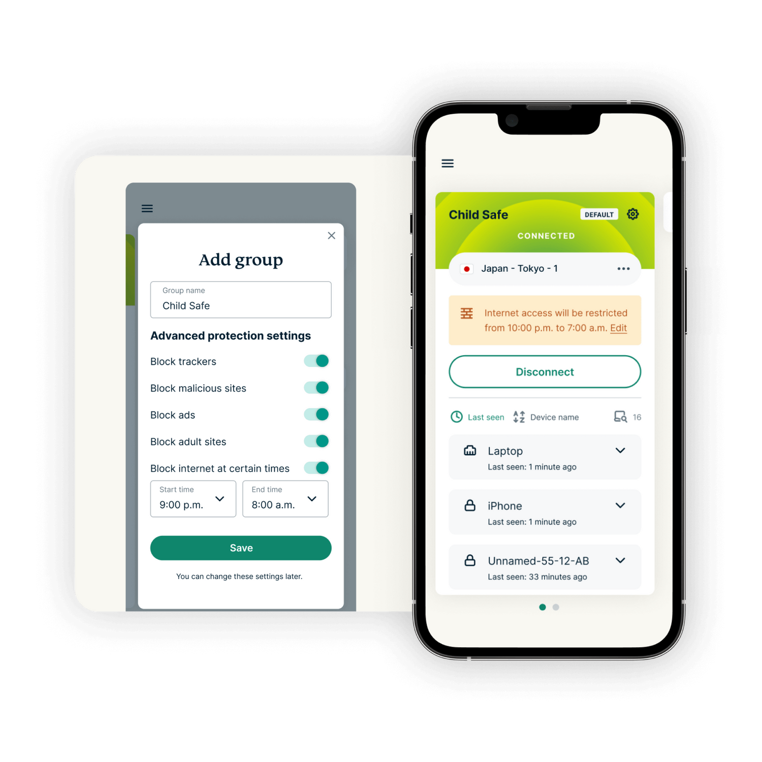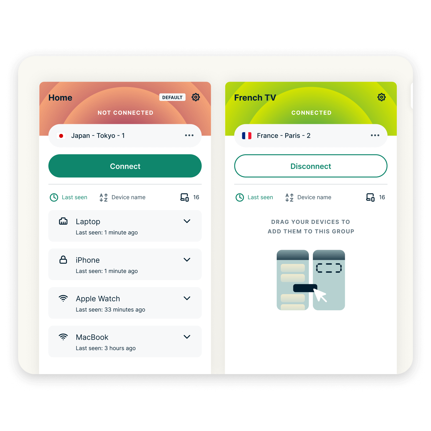 Create up to five groups for all your devices—each with its own VPN location, or excluded from the VPN entirely.